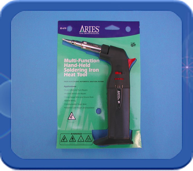 De Aries ES-670 is een handbrander met een dubbele functie, de brander kan ingezet worden met open vlam en met soldeerfunctie. Geschikt voor solderen, buitenactiviteiten, camping, reparaties in en rond huis, laboratoriums, reparatie van elektrische en elektronische circuits, aansluitingen op printplaten, solderen algemeen, reparatie van sieraden en brilmonturen e.d. De brander is voorzien van een pi?zo ontsteking.