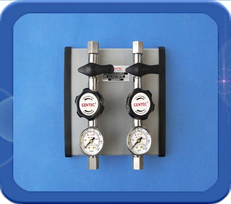 Dit mesing verchroomde tweevoudige afnamepunt is regelbaar van 0-10 bar. Het afnamepunt heeft een leak rate van 2 x 10-8 atm.cc/sec. He.