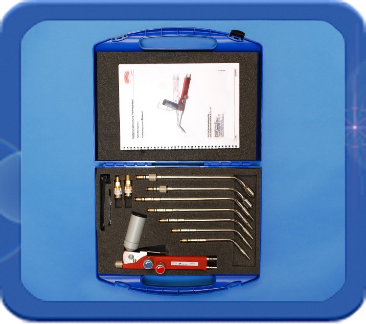 Eenvoudige set voor handmatig autogeen poederspuiten voor een aantal specifieke vlamspuitpoeders die direct insmelten op het werkstuk. De set is geschikt voor acetyleen-zuurstof.