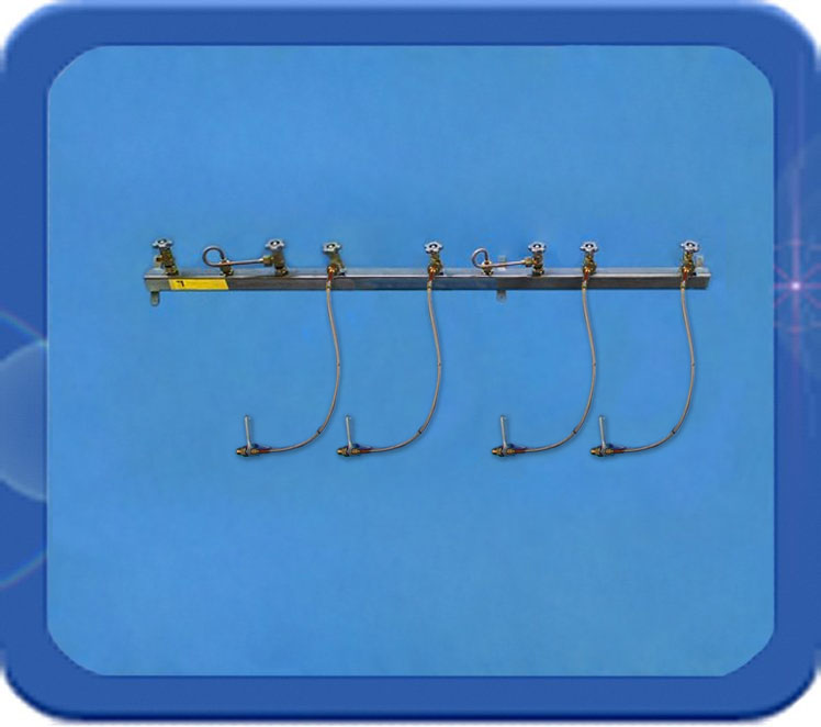 De batterijbalk 2 x 4 cilinders bestaat uit een RVS hoekprofiel met aardaansluiting met 2 x vier cilinderafsluiters, 2 sectieafsluiters en een hoofdafsluiter aan de linker zijde, acht 75 cm RVS/PTFE batterijslangen met 21,8 l aansluiting voor op de cilinder en een gereduceerde afblaasafsluiter met vlamdover DGN. Met de sectieafsluiters kan de linker of de linker sectie afgesloten worden. Staan beide sectieafsluiters open, dan wordt uit alle acht de flessen tegelijk afgenomen. Alle afsluiters staan onder een hoek van 45 graden naar beneden gericht, zodat de afsluiters makkelijk te openen zijn en de slang niet kan knikken. Voor de hoofdafsluiter houden we de 21,8 l uitwendige cilinderaansluiting aan . De afstand tussen de cilinderafsluiters komt overeen met de afstand tussen de cilinders bij de flesbalk.