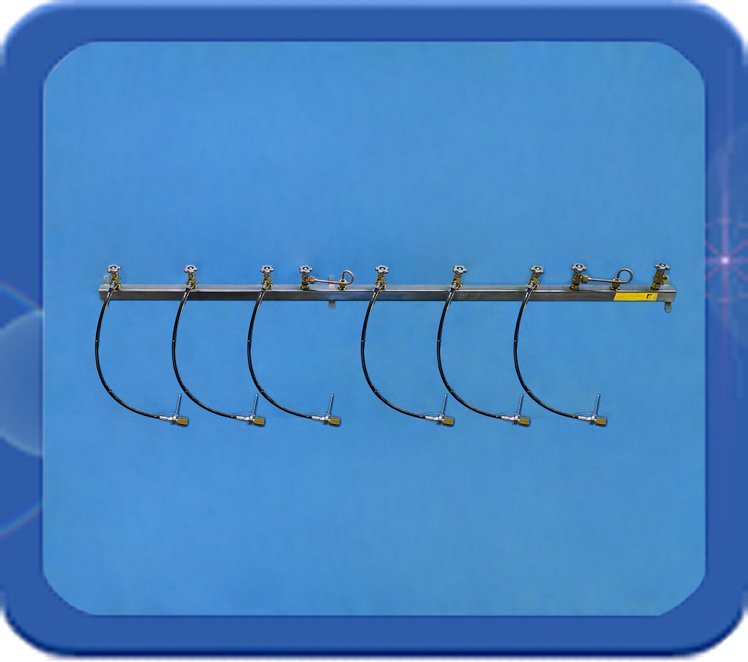De batterijbalk 2 x 3 cilinders bestaat uit een RVS hoekprofiel met 2 x drie cilinderafsluiters, 2 sectieafsluiters en een hoofdafsluiter aan de linker zijde, zes 75 cm RVS/PTFE batterijslangen met beugel aansluitingen voor op de cilinder. Met de sectieafsluiters kan de linker of de rechter sectie afgesloten worden. Staan beide sectieafsluiters open, dan wordt uit alle zes de flessen tegelijk afgenomen. Alle afsluiters staan onder een hoek van 45 graden naar beneden gericht, zodat de afsluiters makkelijk te openen zijn en de slang niet kan knikken. Voor de hoofdafsluiter houden we de 21,8 l uitwendige cilinderaansluiting aan . De afstand tussen de cilinderafsluiters komt overeen met de afstand tussen de cilinders bij de flesbalk.